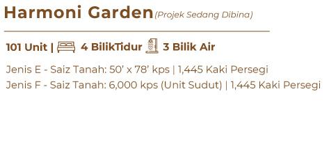 Pemaju: Three G Development Sdn. Bhd. • Alamat: No 11-4-1, Jalan 4/101C, Cheras Business Centre, Taman Cheras, Batu 5, Jalan Cheras. • No. Lesen Pemaju: 20066-2/08-2023/0630(L) • Tempoh Sah: 24/08/2021 – 23/08/2023. • No. Permit Iklan & Jualan: 20066-2/08-2023/0630(P) . Tempoh Sah: 24/08/2021 – 23/08/2023. • Pihak Kuasa Yang Meluluskan: Majlis Daerah Simpang Renggam. • No. Pelan Rujukan: MDSR/OSC/2019/PB/09 • Pemilikan Tanah: 99 Tahun (Berakhir Pada 09/03/2100). • Sekatan-sekatan Kepentingan: Tanah yang dikurniakan ini tidak boleh dijual, dicagar, digadai, dipajak atau dipindahmilik dengan apa cara sekalipua, termasuk dengan cara menggunakan segala surat perjanjian yang bertujuan untuk melepaskan/menjual tanah ini tanpa kebenaran Pihak Berkuasn Negeri. • Beban Tanah: Bebas. • Jangka Masa Siap: Mac 2024. • Bilangan Unit: 49 Unit (Rumah Sesebuah) • Bil Tingkat: 1 . • Harga Jualan: RM 638,000(Min) – RM 726,000(Mak)